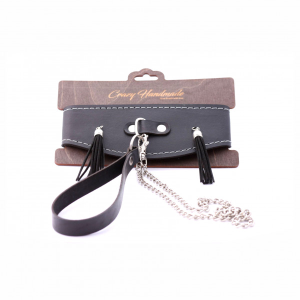 Ошейник с кисточками + поводок "Crazy Handmade" черный, кожа